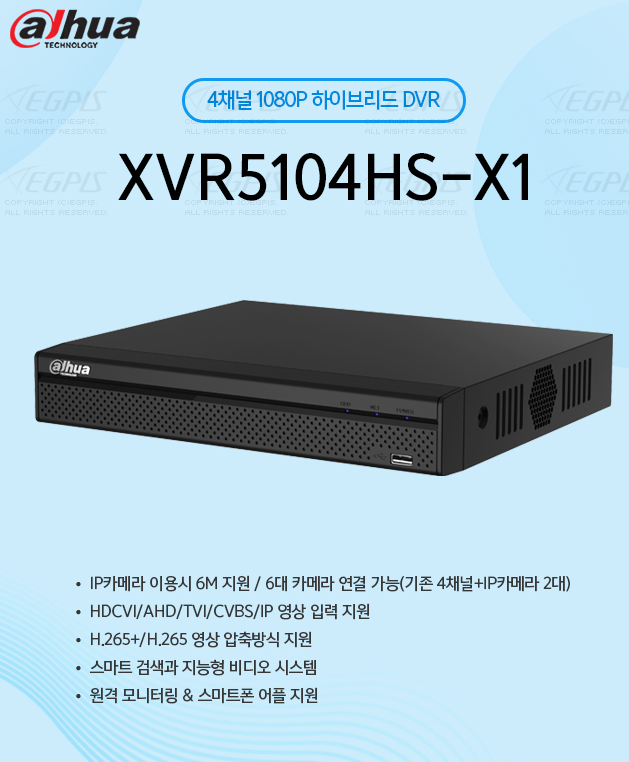 4채널 2MP 하이브리드 DVR, IP카메라 이용시 6M 지원 / 6대 카메라 연결 가능(기존 4채널+IP카메라 2대), HDCVI/AHD/TVI/CVBS/IP 영상 입력 지원, H.265+/H.265 영상 압축방식 지원, 스마트 검색과 지능형 비디오 시스템, 원격 모니터링 & 스마트폰 어플 지원