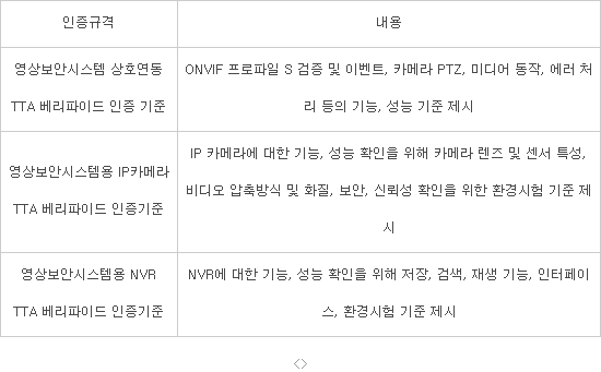 CCTV 시험인증 서비스는 한국정보통신기술협회(TTA)가 수행한다. TTA는 CCTV 제조사, 수요처, 학계, 연구기관 등 전문가 의견을 수렴했다. 상호연동, IP카메라, 네트워크 비디오 레코더(NVR409) 등 시험규격 3종을 개발해 시험인증을 시작한다