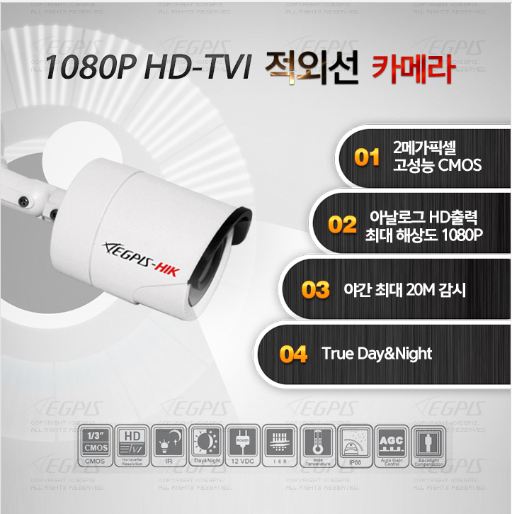 HD-TVI 1/2.7" CMOS SENSOR 1080P 적외선 카메라, 3.6mm 고정 초점 렌즈,True Day & Night, 24EA IR LED, 야간 가시거리 최대 20M, IP66 생활 방수 카메라