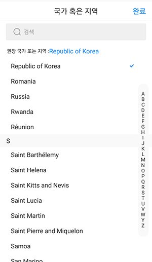 2.국가 선택 확인 -> 권장국가 또는 지역 : Korea ( 한번 터치 )  -> 완료