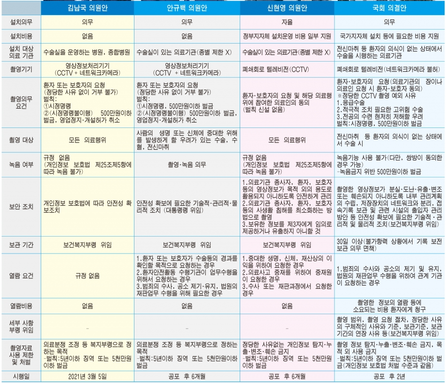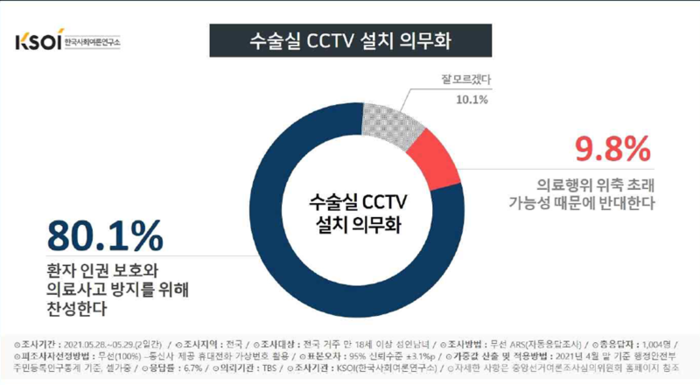 한국사회여론연구소는 TBS 의뢰로 5월 4주차 정기 여론조사에서 수술실 CCTV 설치 의무화에 대한 의견을 물은 결과, 응답자 80.1%가 “환자 인권 보호와 의료사고 방지를 위해 찬성한다”고 답해 압도적으로 많았다.